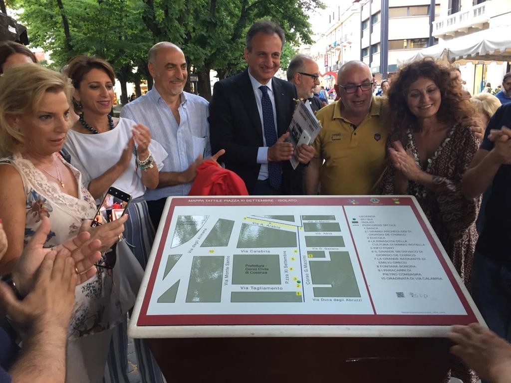 Alla presenza dei rappresentanti del Comune di Cosenza e dell’UICI (Unione Italiana Ciechi e Ipovedenti), mercoledì 26 giugno, alle ore 19:00, il presidente del Lions Club Cosenza Castello Svevo, Francesco Fragale, ha consegnato una mappa tattile, installata nella centralissima piazza XI Settembre, allo scopo di permettere ai non vedenti della nostra comunità di orientarsi in città.