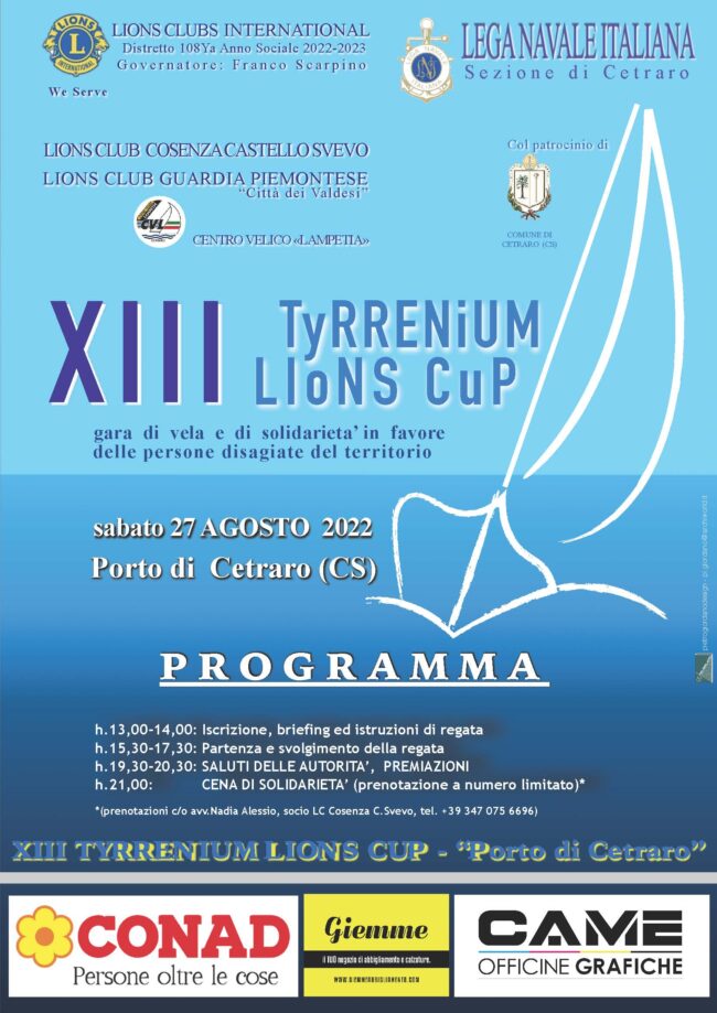 27/08/2022. XIII edizione della Tyrrenium Lions Cup Sabato 27/08/2022 si è svolta la XIII edizione della Tyrrenium Lions Cup, organizzata dai Lions Club di Cosenza Castello Svevo e Guardia Piemontese…