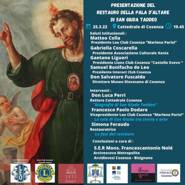 25 marzo 2022. Restauro, la pala d’altare raffigurante San Giuda Taddeo – Cattedrale di Cosenza Dopo attenti lavori di restauro, la pala d’altare raffigurante San Giuda Taddeo eseguita da Giovanbattista…