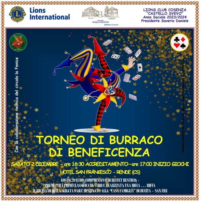 02 DICEMBRE 2023 – Torneo di Burraco di Beneficenza – Casa Famiglia di Bucita. Presso l’Hotel San Francesco di Rende si è tenuto il consueto torneo di burraco finalizzato…