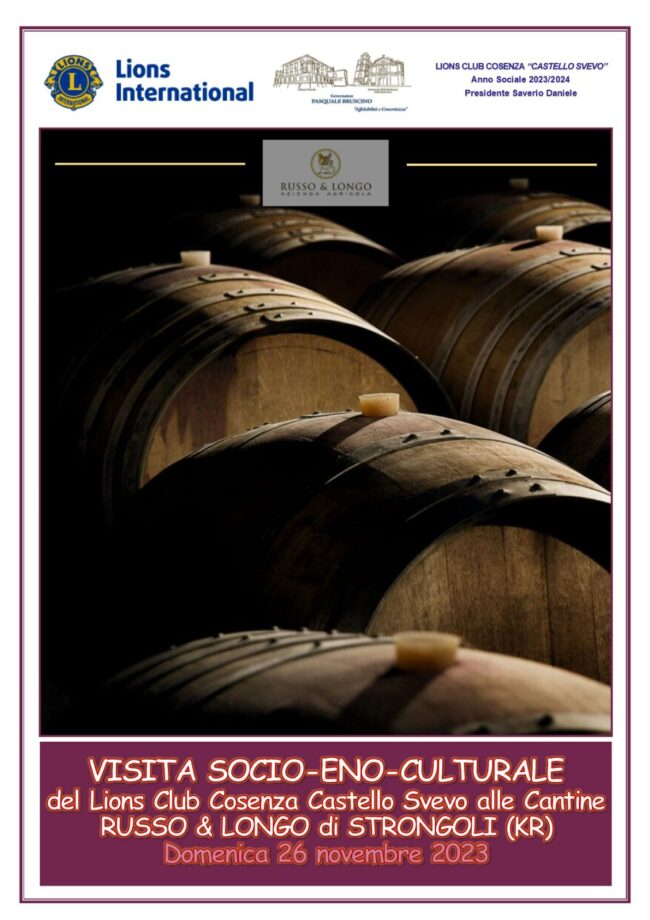 26/11/2023. GIORNATA ENO-SOCIO-CULTURALE DEL CLUB, CON LA VISITA ALLE CANTINE RUSSO E LONGO DI STRONGOLI (KR) Per rinsaldare i vincoli di amicizia e socievolezza come recita il testo degli “Scopi…