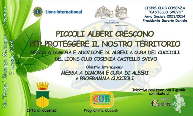 07/05/2024. PICCOLI ALBERI CRESCONO PER PROTEGGERE IL NOSTRO TERRITORIO Il 7 maggio 2024 i Cuccioli del Lions Club Cosenza Castello Svevo sono stati protagonisti nell’ambito dell’iniziativa “Piccoli Alberi crescono per…