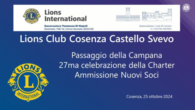 25/10/2024. PASSAGGIO DELLA CAMPANA, XXVII^ CELEBRAZIONE DELLA CHARTER E AMMISSIONE DEI NUOVI SOCI Si è svolta nella splendida cornice della sala ricevimenti Regal Garden in Rovito (CS), il passaggio…