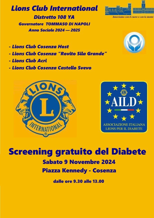 09/11/2024. Screening gratuito del Diabete – Piazza Kennedy Cosenza Oggi 9 novembre 2024, in occasione della giornata mondiale del Diabete, in Piazza Kennedy a Cosenza, dalle 9.30 alle 13.00, è…