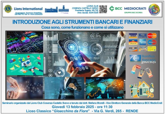 13/02/2025. INTRODUZIONE AGLI STRUMENTI BANCARI E FINANZIARI. Cosa sono, come funzionano e come si utilizzano. Il giorno 13 febbraio 2025 il Lions Club Cosenza Castello Svevo ha organizzato il service “Introduzione…
