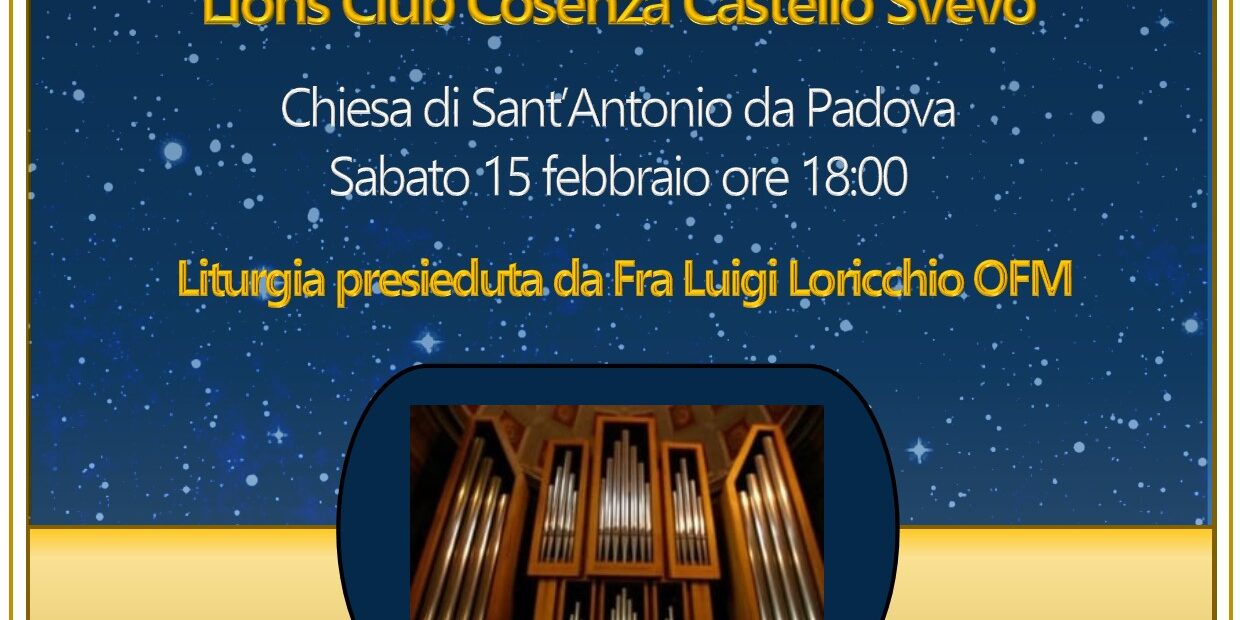 Si svolgerà il prossimo sabato 15 febbraio alle ore 18:00 presso la Chiesa di Sant’Antonio da Padova a Commenda di Rende, la liturgia di Commemorazione dei defunti del Lions Club Cosenza Castello Svevo “IN RICORDO DELLE NOSTRE STELLE”. La liturgia sarà presieduta da Fra Luigi Loricchio OFM.