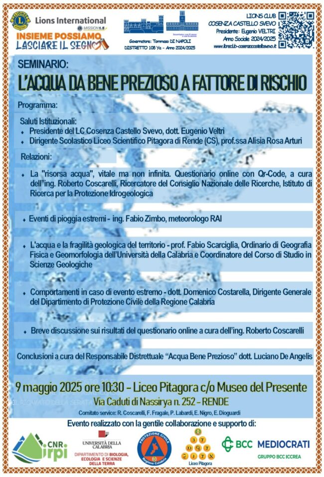 09/05/2025. Seminario “L’ACQUA DA BENE PREZIOSO A FATTORE DI RISCHIO” Il Lions Club Cosenza Svevo ha organizzato presso il Museo del Presente di Rende (CS) un importante seminario sul tema…