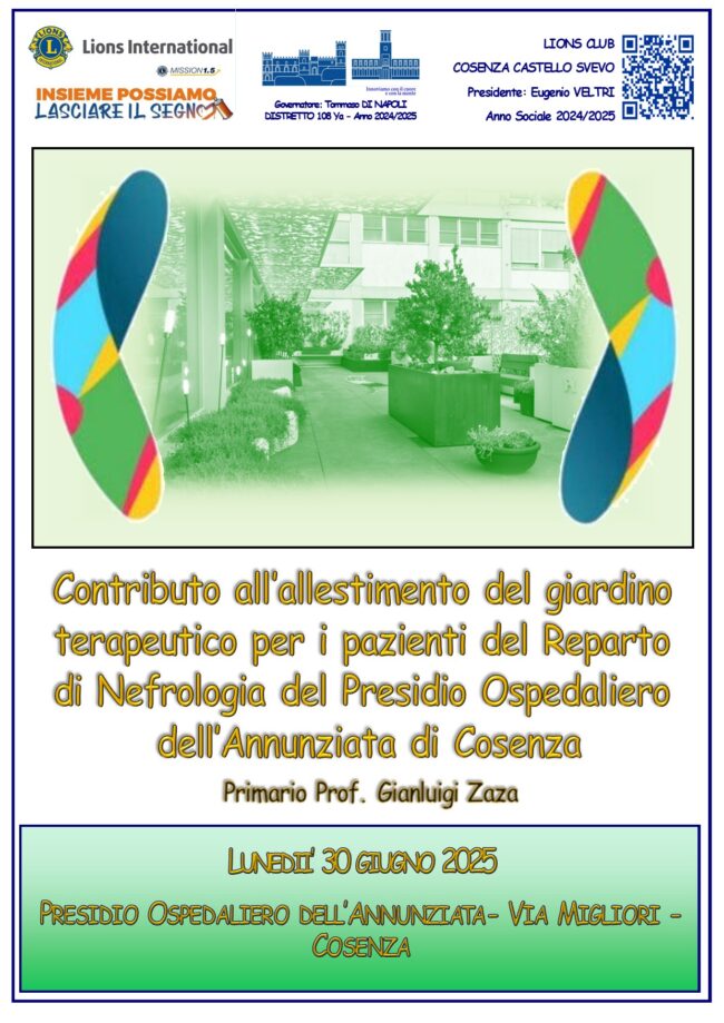Il Lions Club Cosenza Castello Svevo nell’ambito della ristrutturazione in corso del reparto di Nefrologia del Presidio Ospedaliero dell’Annunziata di Cosenza è voluto intervenire offrendo un contributo all’allestimento del giardino…