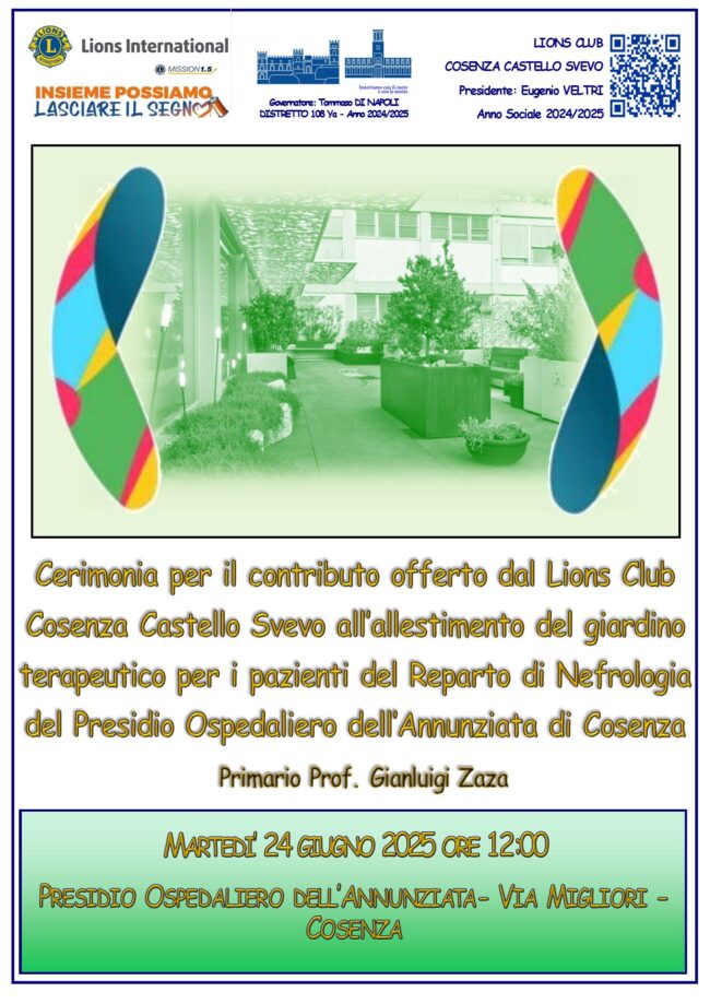 Avverrà il prossimo 24 giugno alle ore 12:00 la cerimonia per il contributo offerto dal Lions Club Cosenza Castello Svevo all’allestimento del giardino terapeutico dei pazienti del Reparto di Nefrologia,…