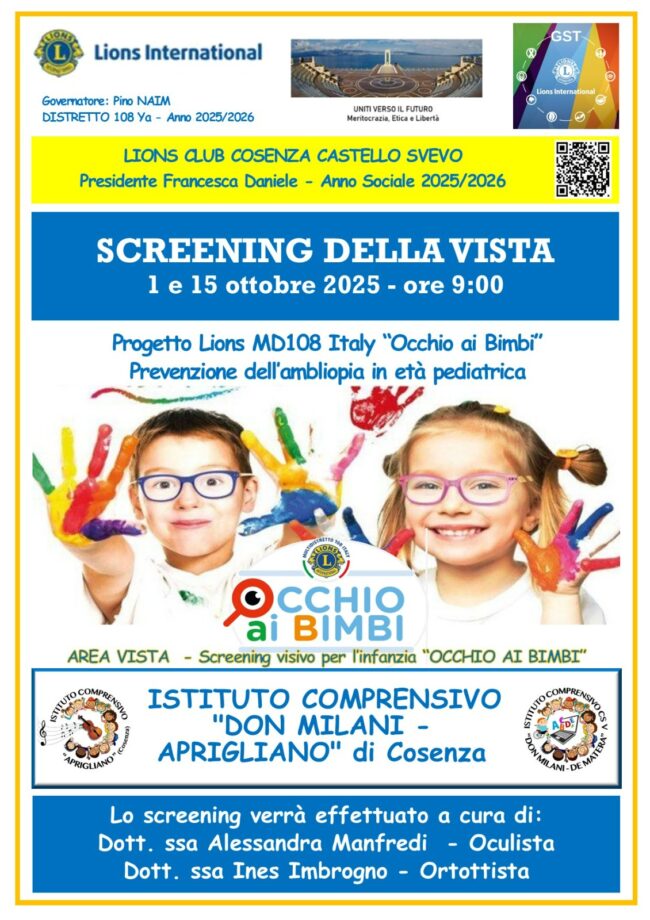 Lo Screening sulla vista “Occhio ai Bimbi”  verrà effettuato  in due giornate, il 1^ ottobre e il 15 ottobre, presso l’Istituto Comprensivo Don Milani di Cosenza. Lo Screening verrà effettuato…