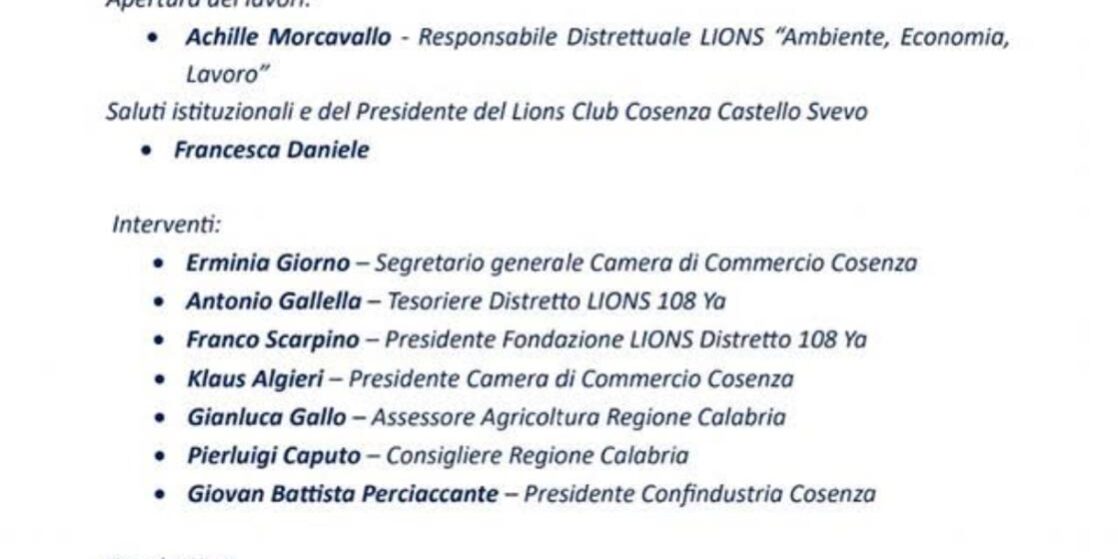 Sabato 13 febbraio 2026, unitamente ad altri Lions Club della Calabria, si sta organizzando presso la Camera di Commercio di Cosenza, su impulso del socio Achille Morcavallo, Responsabile Distrettuale per il service “Ambiente, Economia e Lavoro”, il convegno dal titolo “ La Calabria che verrà ”, che vedrà la partecipazione di autorevoli esponenti della Regione Calabria e delle Associazioni di Categoria