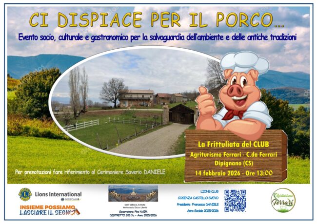 IL prossimo 14 febbraio dalle ore 13:00 avrà luogo il consueto appuntamento “Ci dispiace per il Porco” presso l’Agriturismo Ferrari di Dipignano. L’evento ormai è un appuntamento fisso per il…