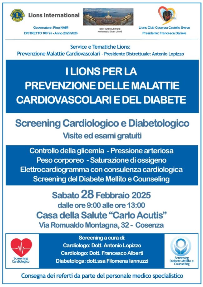 28.02.2026. I LIONS PER LA PREVENZIONE DELLE MALATTIE CARDIOVASCOLARI E DEL DIABETE. Si è svolto presso la  Casa della Salute “Carlo Acutis” di Cosenza il Service distrettuale “Prevenzione Malattie Cardiovascolari.…