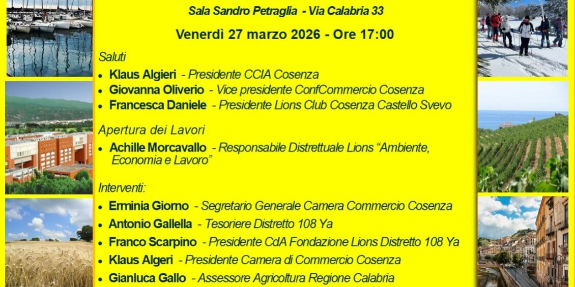 Il Lions Club Cosenza Castello Svevo ha organizzato, il 27 marzo 2026 presso la Sala “Sandro Petraglia” della Camera di Commercio di Cosenza, il convegno dal titolo “La Calabria che verrà”, inserito nell’ambito del service distrettuale “Ambiente, Economia, Lavoro”. L’iniziativa, promossa su impulso del responsabile distrettuale del service, socio Achille Morcavallo, ha rappresentato un importante momento di confronto sulle prospettive di sviluppo economico, sociale e ambientale della Calabria, coinvolgendo istituzioni, associazioni di categoria e mondo imprenditoriale.