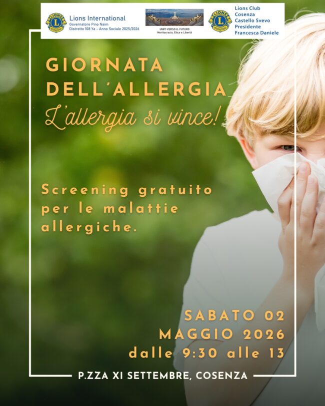 Si terrà dalle 09:30 alle 13:00 in Piazza XI Settembre in Cosenza la “GIORNATA DELL’ALLERGIA . L’allergia si Vince”, la ormai tradizionale giornata del Lions Club Cosenza Castello Svevo, sullo…