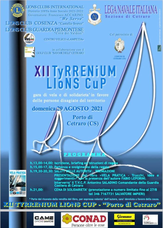29/08/2021. XII^ edizione della Tyrrenium Lions Cup, gara di vela e di solidarietà Domenica 29 agosto, nello specchio d’acqua antistante il Porto di Cetraro (CS), si è svolta la XII…