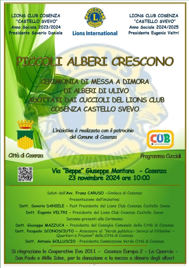23/11/2024. PICCOLI ALBERI CRESCONO PER PROTEGGERE IL TERRITORIO Obiettivi Internazionali: “MESSA A DIMORA E CURA DI ALBERI” e “PROGRAMMA CUCCIOLI” Il 23 novembre 2024 i Cuccioli del Lions Club Cosenza…