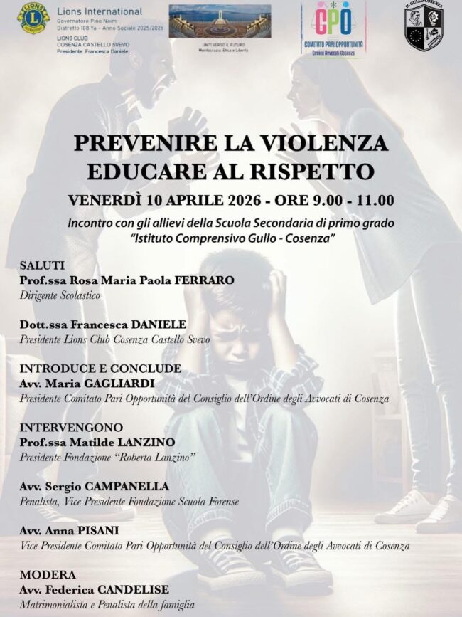 10/04/2026. Seminario “Prevenire la violenza, educare al rispetto” Il Lions Club Cosenza “Castello Svevo” ha organizzato in collaborazione con il Comitato per le Pari Opportunità del Consiglio dell’Ordine degli avvocati…