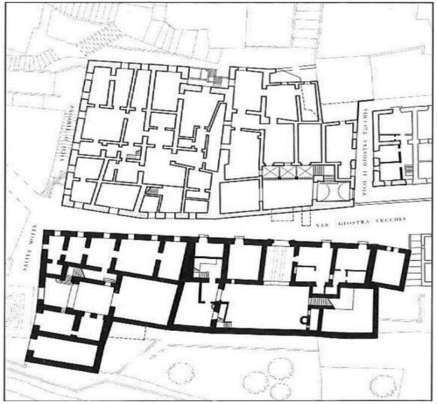 Edificio a tre piani, a pianta rettangolare regolare, con copertura a tetto mista. Il prospetto principale affaccia su via Giostra Vecchia e il secondario ricadente all’interno del cortile e chiuso dal giardino. In facciata l’edificio presenta aperture regolari, con finestre sul primo piano e balconi, alla romana sul secondo. Ingresso ampio con volta a botte. Sul cortile interno, chiuso da giardino, si affacciano aperture non in linea, e ai lati, si sviluppano i collegamenti verticali, composti da due corpi scala coperti da voltine a crociera